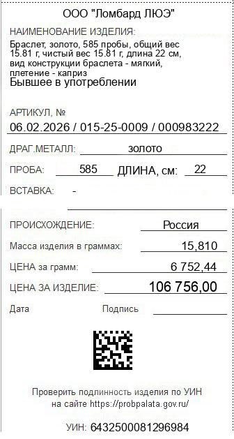 Цена за грамм общего веса: 6752.44Цена за грамм чистого веса: 6752.44Организация: ООО "Ломбард ЛЮЭ"Металл: золотоПроба: 585Артикул: 06.02.2026 / 015-25-0009 / 000983222Базовая единица: шт