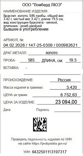 Вставки: НетТолщина, мм: 0.73Ширина, мм: 3.25Клеймо: ДаПлетение: Ромб двойнойСостояние: бывший в употреблении