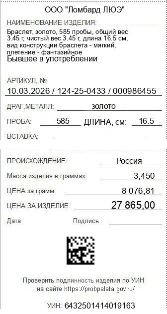 Цена за грамм общего веса: 8076.81Цена за грамм чистого веса: 8076.81Организация: ООО "Ломбард ЛЮЭ"Металл: золотоПроба: 585Артикул: 10.03.2026 / 124-25-0433 / 000986455Базовая единица: шт