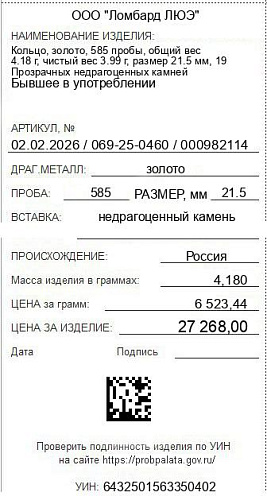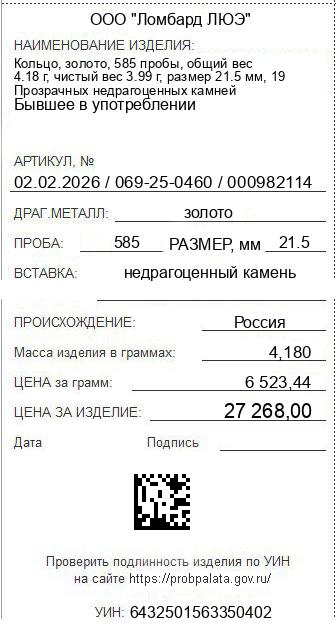Цена за грамм общего веса: 6523.44Цена за грамм чистого веса: 6834.09Организация: ООО "Ломбард ЛЮЭ"Металл: золотоПроба: 585Артикул: 02.02.2026 / 069-25-0460 / 000982114Базовая единица: шт