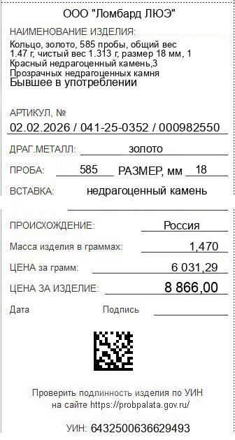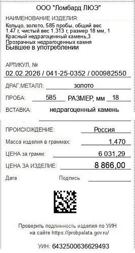 Цена за грамм общего веса: 6031.29Цена за грамм чистого веса: 6752.48Организация: ООО "Ломбард ЛЮЭ"Металл: золотоПроба: 585Артикул: 02.02.2026 / 041-25-0352 / 000982550Базовая единица: шт