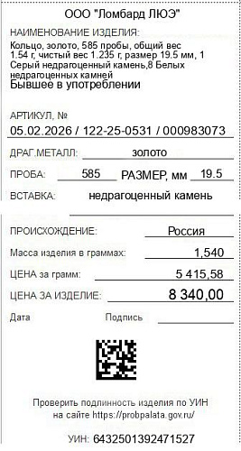 Цена за грамм общего веса: 5415.58Цена за грамм чистого веса: 6753.04Организация: ООО "Ломбард ЛЮЭ"Металл: золотоПроба: 585Артикул: 05.02.2026 / 122-25-0531 / 000983073Базовая единица: шт