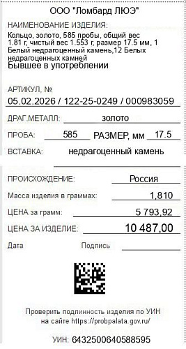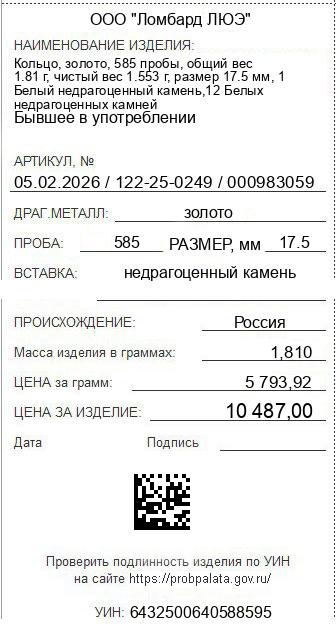 Цена за грамм общего веса: 5793.92Цена за грамм чистого веса: 6752.74Организация: ООО "Ломбард ЛЮЭ"Металл: золотоПроба: 585Артикул: 05.02.2026 / 122-25-0249 / 000983059Базовая единица: шт