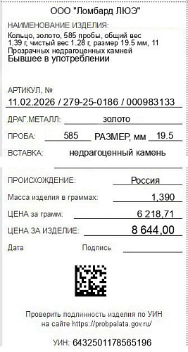 Цена за грамм общего веса: 6218.71Цена за грамм чистого веса: 6753.13Организация: ООО "Ломбард ЛЮЭ"Металл: золотоПроба: 585Артикул: 11.02.2026 / 279-25-0186 / 000983133Базовая единица: шт