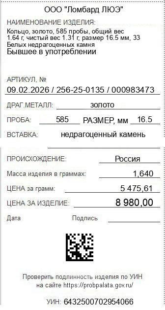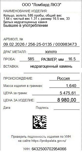 Цена за грамм общего веса: 5475.61Цена за грамм чистого веса: 6854.96Организация: ООО "Ломбард ЛЮЭ"Металл: золотоПроба: 585Артикул: 09.02.2026 / 256-25-0135 / 000983473Базовая единица: шт