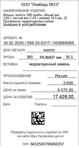 Цена за грамм общего веса: 6575.85Цена за грамм чистого веса: 7171.19Организация: ООО "Ломбард ЛЮЭ"Металл: золотоПроба: 585Артикул: 16.02.2026 / 056-25-0317 / 000984589Базовая единица: шт