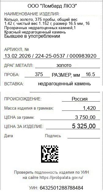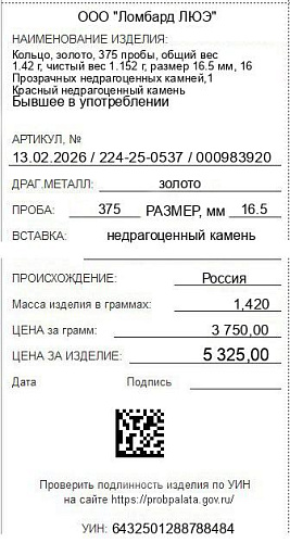 Цена за грамм общего веса: 3750Цена за грамм чистого веса: 4622.4Организация: ООО "Ломбард ЛЮЭ"Металл: золотоПроба: 375Артикул: 13.02.2026 / 224-25-0537 / 000983920Базовая единица: шт