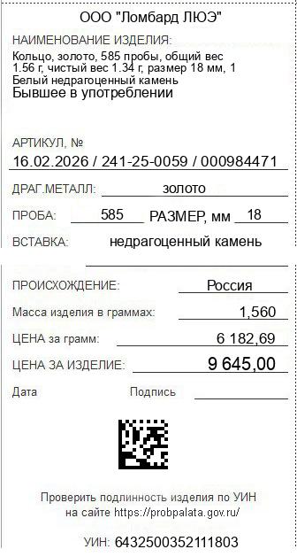 Цена за грамм общего веса: 6182.69Цена за грамм чистого веса: 7197.76Организация: ООО "Ломбард ЛЮЭ"Металл: золотоПроба: 585Артикул: 16.02.2026 / 241-25-0059 / 000984471Базовая единица: шт
