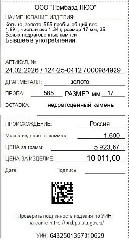 УИН: 6432501357310629Описание вставок: 35 Белых недрагоценных камнейОбщий вес: 1.69Чистый вес: 1.34Вес вставок: 0.35Высота, мм: 4.5Высота шинки, мм: 1.8