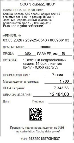 УИН: 6432501557054537Описание вставок: 1 Зеленый недрагоценный камень,14 бриллиантов Кр-17 - 0,056 кар.3/55Общий вес: 1.7Чистый вес: 1.461Вес вставок: 0.239Высота, мм: 7Высота шинки, мм: 1