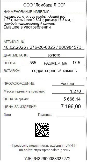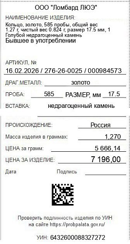 Цена за грамм общего веса: 5666.14Цена за грамм чистого веса: 8733.01Организация: ООО "Ломбард ЛЮЭ"Металл: золотоПроба: 585Артикул: 16.02.2026 / 276-26-0025 / 000984573Базовая единица: шт
