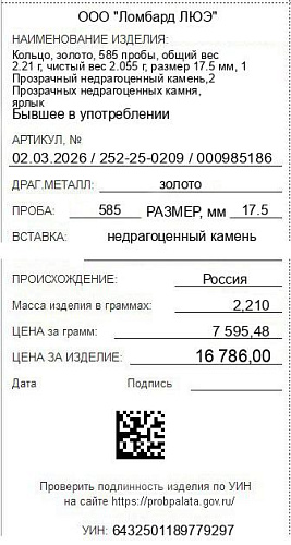 Цена за грамм общего веса: 7595.48Цена за грамм чистого веса: 8168.37Организация: ООО "Ломбард ЛЮЭ"Металл: золотоПроба: 585Артикул: 02.03.2026 / 252-25-0209 / 000985186Базовая единица: шт