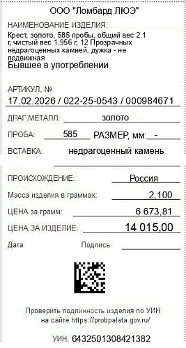 Цена за грамм общего веса: 6673.81Цена за грамм чистого веса: 7165.13Организация: ООО "Ломбард ЛЮЭ"Металл: золотоПроба: 585Артикул: 17.02.2026 / 022-25-0543 / 000984671Базовая единица: шт