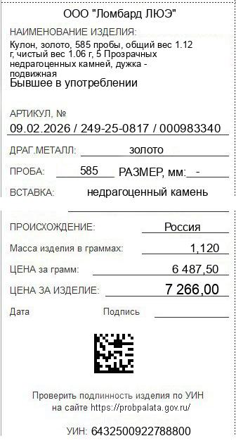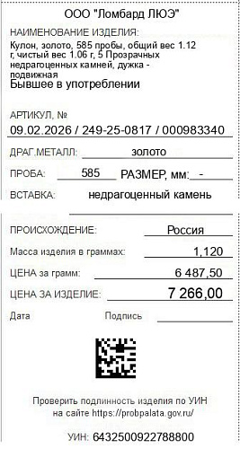 Цена за грамм общего веса: 6487.5Цена за грамм чистого веса: 6854.72Организация: ООО "Ломбард ЛЮЭ"Металл: золотоПроба: 585Артикул: 09.02.2026 / 249-25-0817 / 000983340Базовая единица: шт