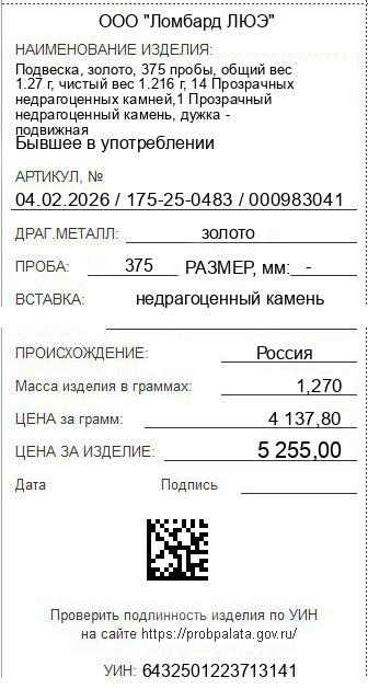 Цена за грамм общего веса: 4188.19Цена за грамм чистого веса: 4374.18Организация: ООО "Ломбард ЛЮЭ"Металл: золотоПроба: 375Артикул: 04.02.2026 / 175-25-0483 / 000983041Базовая единица: шт