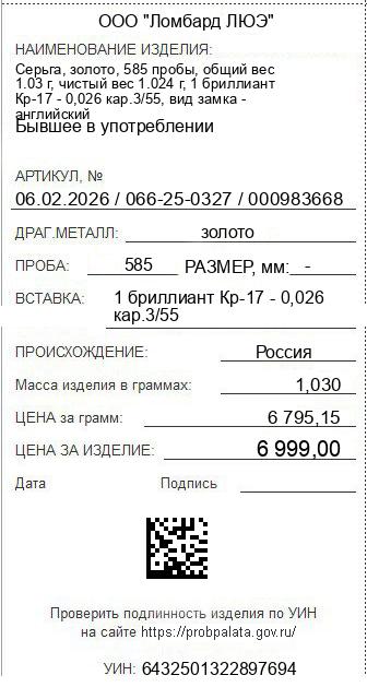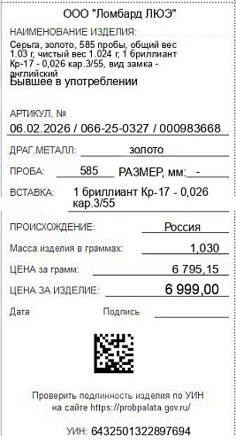 Цена за грамм общего веса: 6795.15Цена за грамм чистого веса: 6834.96Организация: ООО "Ломбард ЛЮЭ"Металл: золотоПроба: 585Артикул: 06.02.2026 / 066-25-0327 / 000983668Базовая единица: шт