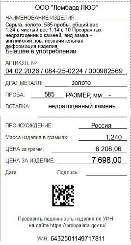 Цена за грамм общего веса: 6208.06Цена за грамм чистого веса: 6752.63Организация: ООО "Ломбард ЛЮЭ"Металл: золотоПроба: 585Артикул: 04.02.2026 / 084-25-0224 / 000982569Базовая единица: шт
