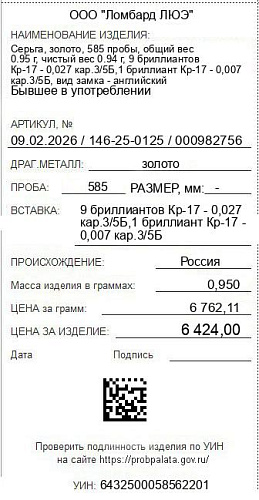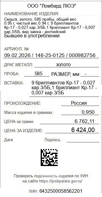 Цена за грамм общего веса: 6762.11Цена за грамм чистого веса: 6834.04Организация: ООО "Ломбард ЛЮЭ"Металл: золотоПроба: 585Артикул: 09.02.2026 / 146-25-0125 / 000982756Базовая единица: шт