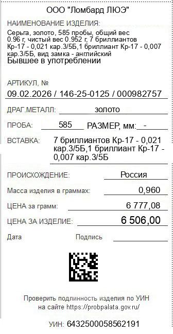 Цена за грамм общего веса: 6777.08Цена за грамм чистого веса: 6834.03Организация: ООО "Ломбард ЛЮЭ"Металл: золотоПроба: 585Артикул: 09.02.2026 / 146-25-0125 / 000982757Базовая единица: шт