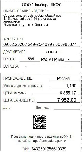 Цена за грамм общего веса: 6855.17Цена за грамм чистого веса: 6855.17Организация: ООО "Ломбард ЛЮЭ"Металл: золотоПроба: 585Артикул: 09.02.2026 / 249-25-1099 / 000983374Базовая единица: шт