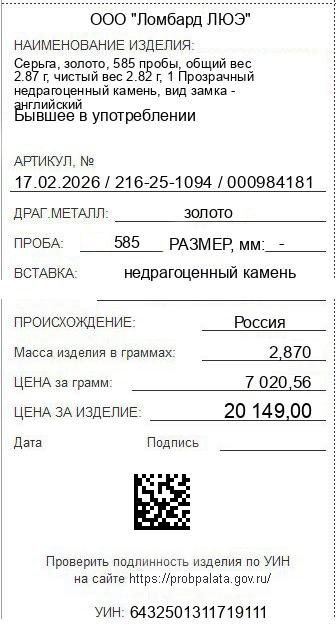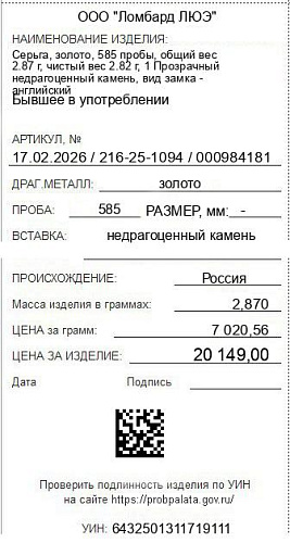 Цена за грамм общего веса: 7020.56Цена за грамм чистого веса: 7145.04Организация: ООО "Ломбард ЛЮЭ"Металл: золотоПроба: 585Артикул: 17.02.2026 / 216-25-1094 / 000984181Базовая единица: шт