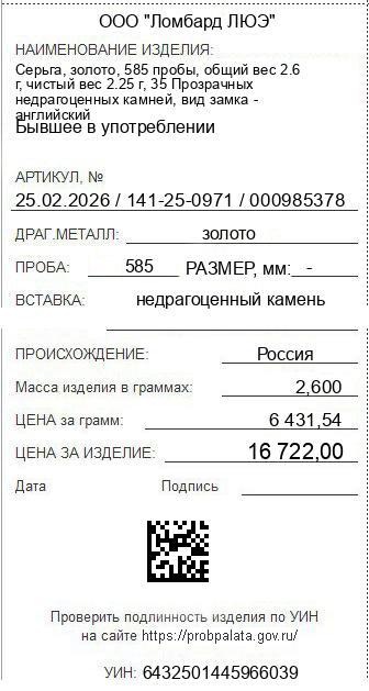 Цена за грамм общего веса: 6431.54Цена за грамм чистого веса: 7432Организация: ООО "Ломбард ЛЮЭ"Металл: золотоПроба: 585Артикул: 25.02.2026 / 141-25-0971 / 000985378Базовая единица: шт