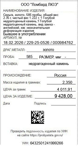 Цена за грамм общего веса: 4011.91Цена за грамм чистого веса: 7715.22Организация: ООО "Ломбард ЛЮЭ"Металл: золотоПроба: 585Артикул: 18.02.2026 / 229-25-0526 / 000984762Базовая единица: шт