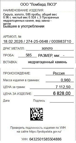 Цена за грамм общего веса: 7112.5Цена за грамм чистого веса: 7389.61Организация: ООО "Ломбард ЛЮЭ"Металл: золотоПроба: 585Артикул: 18.02.2026 / 274-25-0648 / 000983710Базовая единица: шт