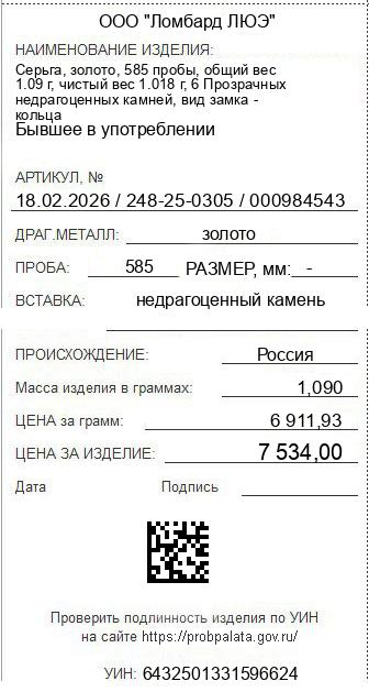 Цена за грамм общего веса: 6911.93Цена за грамм чистого веса: 7400.79Организация: ООО "Ломбард ЛЮЭ"Металл: золотоПроба: 585Артикул: 18.02.2026 / 248-25-0305 / 000984543Базовая единица: шт