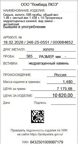 Цена за грамм общего веса: 7175.68Цена за грамм чистого веса: 7385.26Организация: ООО "Ломбард ЛЮЭ"Металл: золотоПроба: 585Артикул: 18.02.2026 / 246-25-0551 / 000984852Базовая единица: шт