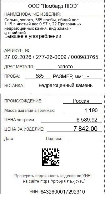 Цена за грамм общего веса: 6589.92Цена за грамм чистого веса: 8084.54Организация: ООО "Ломбард ЛЮЭ"Металл: золотоПроба: 585Артикул: 27.02.2026 / 277-26-0009 / 000983765Базовая единица: шт
