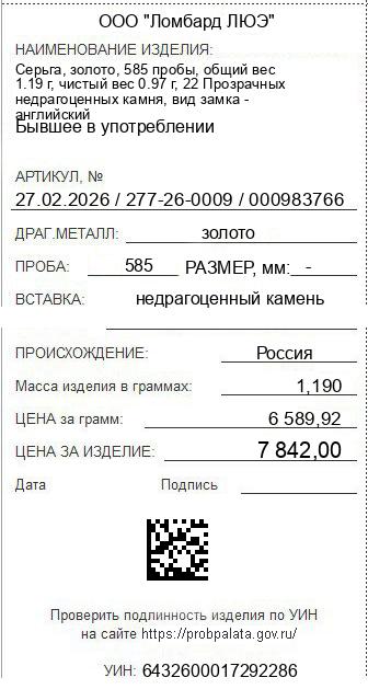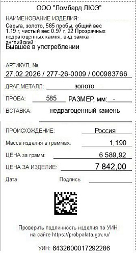 Цена за грамм общего веса: 6589.92Цена за грамм чистого веса: 8084.54Организация: ООО "Ломбард ЛЮЭ"Металл: золотоПроба: 585Артикул: 27.02.2026 / 277-26-0009 / 000983766Базовая единица: шт
