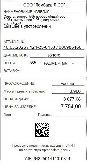 Цена за грамм общего веса: 8077.08Цена за грамм чистого веса: 8077.08Организация: ООО "Ломбард ЛЮЭ"Металл: золотоПроба: 585Артикул: 10.03.2026 / 124-25-0433 / 000986460Базовая единица: шт
