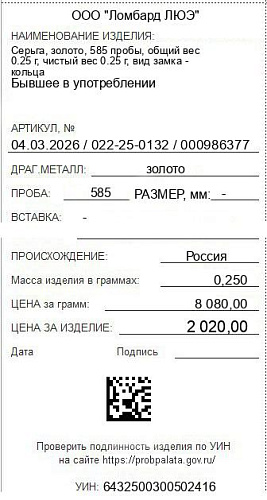 Цена за грамм общего веса: 8080Цена за грамм чистого веса: 8080Организация: ООО "Ломбард ЛЮЭ"Металл: золотоПроба: 585Артикул: 04.03.2026 / 022-25-0132 / 000986377