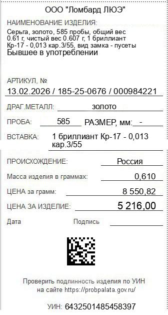 Цена за грамм общего веса: 8550.82Цена за грамм чистого веса: 8593.08Организация: ООО "Ломбард ЛЮЭ"Металл: золотоПроба: 585Артикул: 13.02.2026 / 185-25-0676 / 000984221Базовая единица: шт