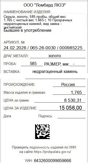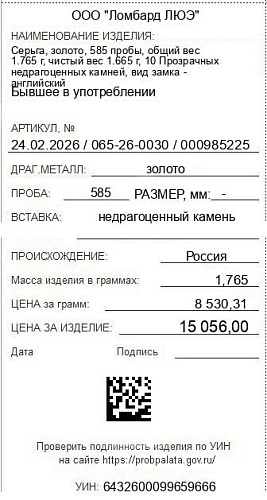 Цена за грамм общего веса: 8530.31Цена за грамм чистого веса: 9042.64Организация: ООО "Ломбард ЛЮЭ"Металл: золотоПроба: 585Артикул: 24.02.2026 / 065-26-0030 / 000985225Базовая единица: шт