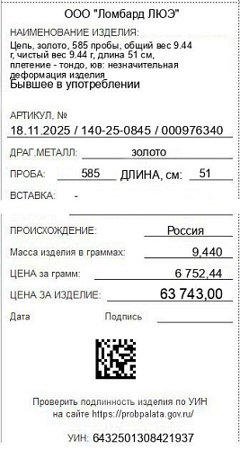 Цепь золото 585, общий вес - 9.44 г, чистый вес - 9.44 г, 51 см