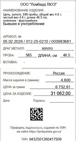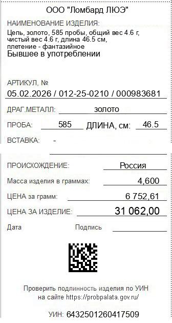 Цена за грамм общего веса: 6752.61Цена за грамм чистого веса: 6752.61Организация: ООО "Ломбард ЛЮЭ"Металл: золотоПроба: 585Артикул: 05.02.2026 / 012-25-0210 / 000983681Базовая единица: шт