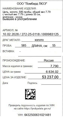 Цепь золото 585, общий вес - 7.79 г, чистый вес - 7.79 г, 55 см