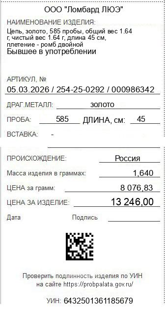 Цена за грамм общего веса: 8076.83Цена за грамм чистого веса: 8076.83Организация: ООО "Ломбард ЛЮЭ"Металл: золотоПроба: 585Артикул: 05.03.2026 / 254-25-0292 / 000986342Базовая единица: шт